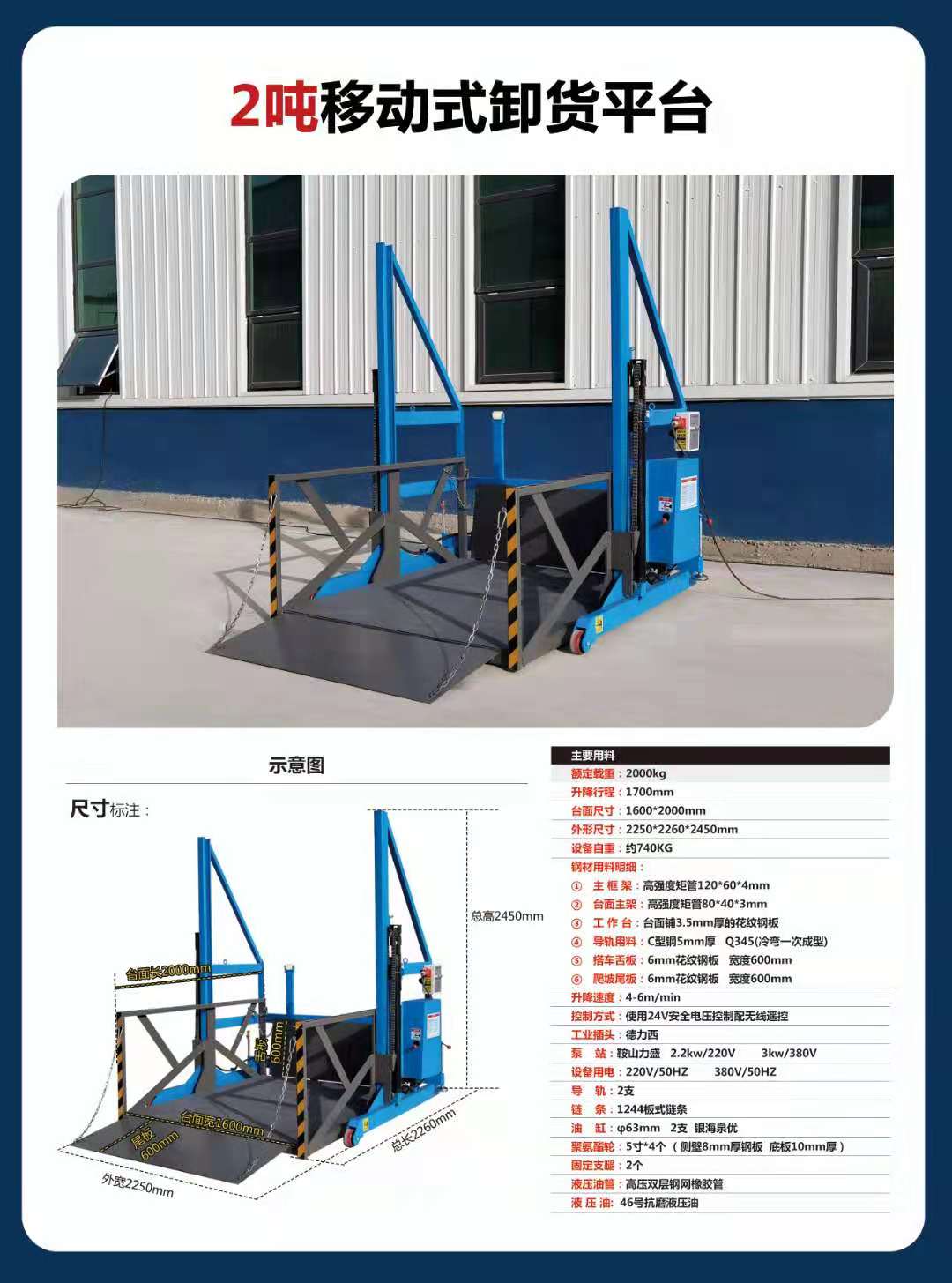 移动装卸平台常规可以分为2吨和3吨两种规格,升降范围在1.7米以内,适用于大多数常规集装箱车辆的高度。适用场所:仓库、车站、码头、储物流基地等行业。可单人操作,不占用空间,移动灵活方便,大大提高装卸作业效率。